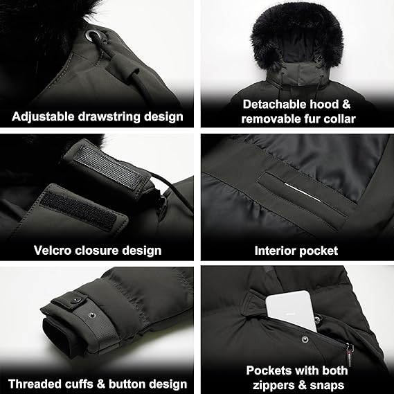 The winter jacket features adjustable sleeve openings with Rib-knit storm cuffs and velcro and sweep trap in warm air as well as an inside drawcord at hood to give you a perfect fit while protecting against the elements.
